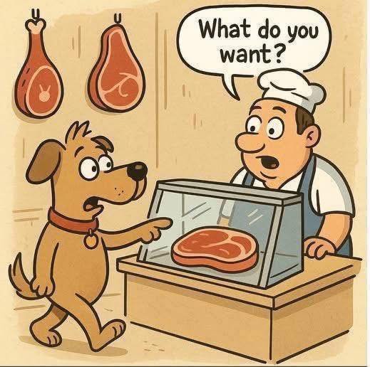 So the butcher wraps up a two-pound steak and four pork chops, and places the bag in the dog’s mouth.